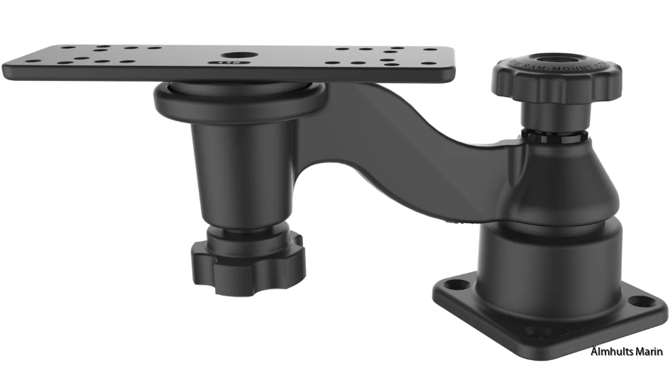 The RAM-109H consists of a 6" long bent swing arm mounted on a horizontal surface base. At the device mounting end is a rectangular 6.25" x 2" plate. There are two pivoting points on the mount: one at the base of the swing arm and one at the center of the rectangular plate. Each pivoting point allows a complete 360-degree rotation.