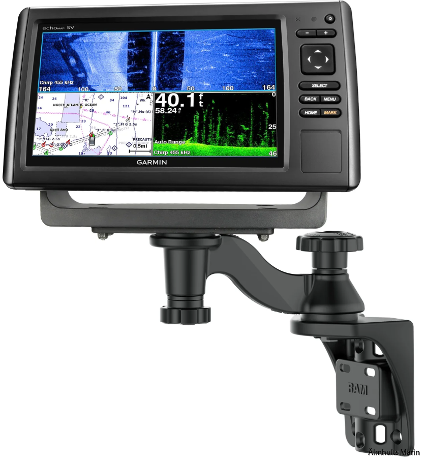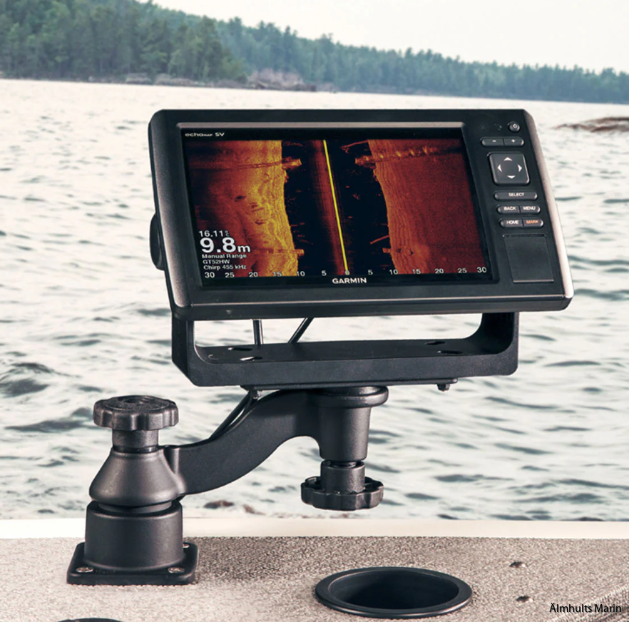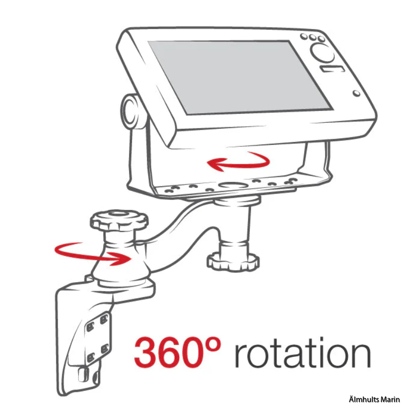 The RAM single swing arm mount consists of a 6" long swing arm mounted on a vertical surface mounting base. At the device mounting end of the mount is a rectangular 6.25" x 2" plate. There are two (2) pivoting points on the mount. One at the swing arm and base and one at the center of the rectangular plate and the end of the swing arm. Each pivoting point allows a complete 360 degree rotation.
